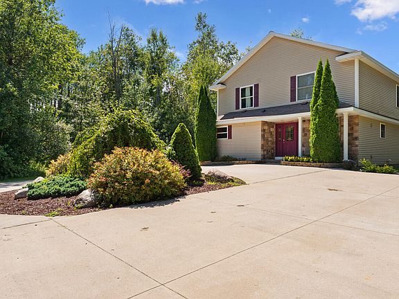 Unique Alpena County property with a 5.4-acre home site, just 8 minutes from downtown, at the end of a private road. Ideal for families & outdoor lovers, offering great hunting, a pond, & easy access to Devils Lake trail system for ATVs & snowmobiles. The home features an open floor plan, energy-efficient design, newer appliances, granite countertops, hardwood floors, a forced air furnace with central A/C, & an upper-level family room with scenic views. Main-level master includes an en-suite bath & walk-in closet. Upstairs, two large bedrooms fit king beds & bunk beds. The family room has a granite-topped built-in buffet for entertaining. Additional highlights include a 30' x 90' detached garage with power, radiant heat, insulation, & a built-in air compressor system. A must-see!