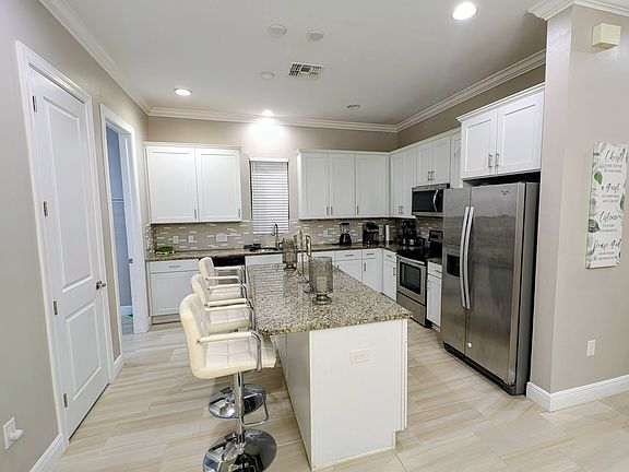 Kitchen: Granite countertops, stainless steel appliances (dishwasher, refrigerator, range, microwave), kitchen island