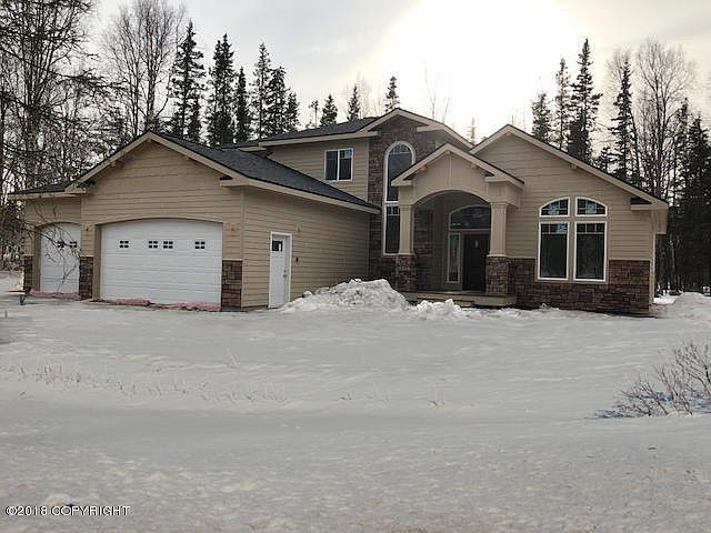 Another GORGEOUS home by Elegant Homes. This one includes all of Elegant Homes standard high-end finishes plus a few new modern touches. There are 4 beds, master suite on main floor, plus an office with a huge 3 car garage. Soaring ceilings, custom tile work, a stacked rock fireplace with built-ins, beautiful granite counters throughout, a chefs kitchen with alarge island & a beautiful apron sink, the exquisite master suite features a modern stand alone soaking tub, a large separate shower, double sinks, heated floors, private privy, and a huge walk-in closet, these are just a few of the features you can expect. Home also comes w/ lap siding all the way around, lighted soffits, wiring for generator back up, 30 Amp RV, & 220 in garage. There is also a large covered back w/ LED can lighting . Still time for buyers to pick colors and many of the upgrades. Located in Wasilla's newest subdivision on a large private acre lot this home is conveniently located close to everything and perfect for commuters.