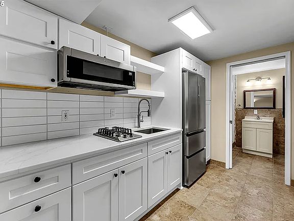 - Newly installed kitchenette with stainless steel appliances (refrigerator, 2-burner cooktop, microwave, and toaster oven. (No permanent oven)