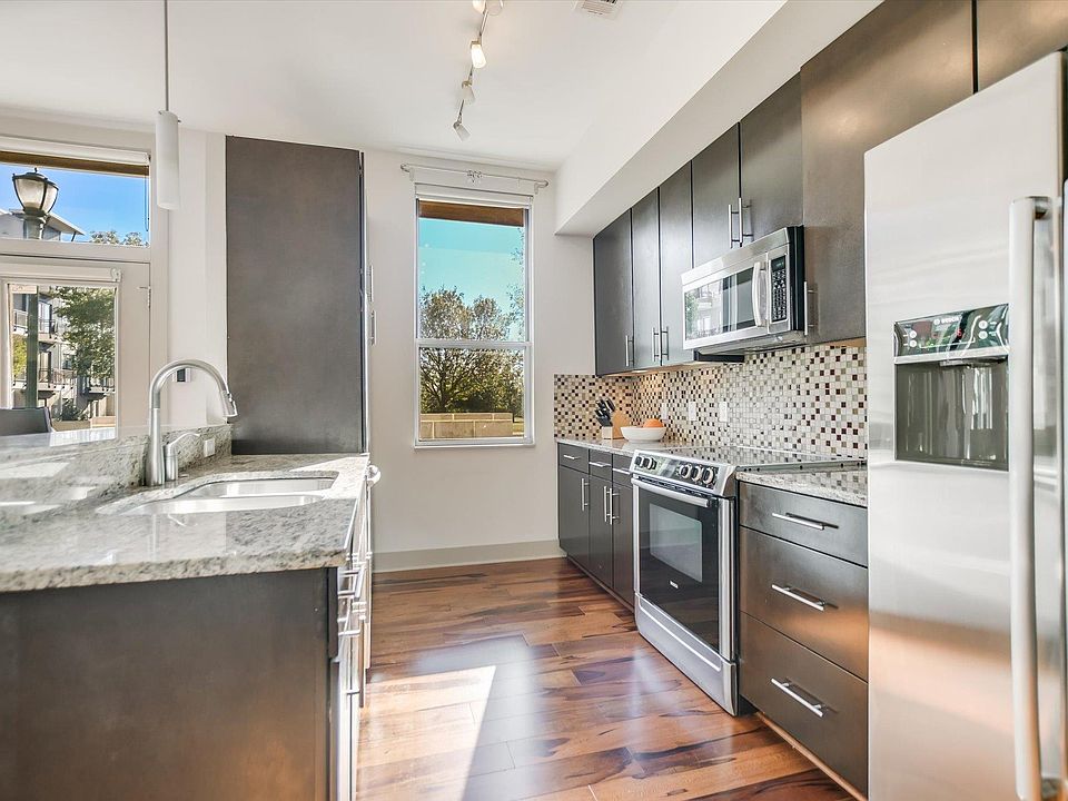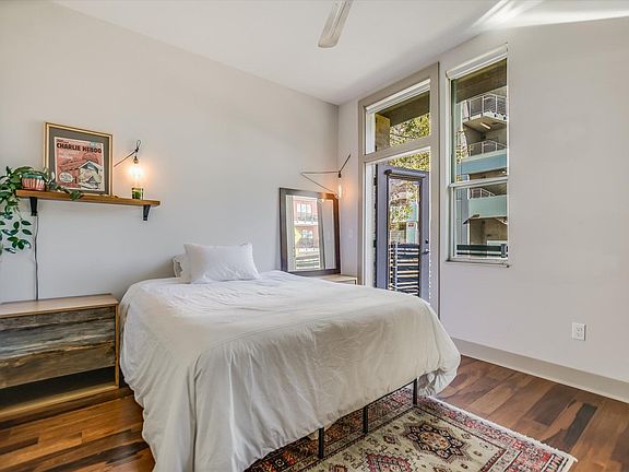 Welcome to this rare ground-level corner residence in the heart of Mueller. Offering the ease and comfort of single-level living furnished or unfurnished, this 2-bedroom, 2-bath condo features direct access from the living room out to a private, fenced patio. Perfect for morning coffee or seamless indoor-outdoor living. No elevators or long hallways needed here; simply step right out onto the neighborhood's tree-lined paths. Inside, you'll find a bright and open layout with large picture windows that invite natural light throughout the day. The kitchen is thoughtfully designed with granite countertops, stainless steel appliances, and plenty of storage, opening to a spacious living and dining area ideal for everyday living and entertaining. The primary suite includes a walk-in closet and en-suite bath with dual sinks and a walk-in shower, while the second bedroom works perfectly as a guest room, office, or studio. Living in Mueller means embracing walkability and convenience. Enjoy being just steps from Mueller Lake Park, the Sunday Farmers' Market, The Thinkery, H-E-B, and beloved local cafes, restaurants, and breweries. Jog the trails in the morning, grab lunch by the water, pick up groceries on foot, and spend evenings enjoying the neighborhood's vibrant community spaces and events. This condo combines privacy, accessibility, and location in one of Austin's most sought-after neighborhoods.