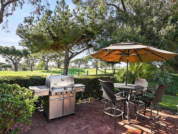 Gorgeous single-level end unit in secluded setting with Southwest view to golf course. Sumptuous dark-stained wood floors & white-washed natural vaulted beams. Delightful living room with lush carpeting, vaulted ceiling, fireplace with marble surround & wood casing. Lots of windows to golf view & private back patio & grassy yard. Gourmet kitchen with expansive golf view, wood floor, granite counters with glass mosaic tile backsplash, cherry finished cabinets, GE Profile gas range, refrigerator, & wine cooler. Informal dining area with hilltop & SW sunny view, built-in cabinets,& inset lighting. Dining room with golf view from many angles, wood floor, vaulted ceiling, French doors to patio, & wide-beam blinds. Primary bedroom to back of home with golf course view. French doors open to secluded patio & large grassy area. High ceiling. Two closets. Luxurious primary bath with tile floor, large walk-in shower with skylight. Granite counters. Two sinks. Cherry finished cabinets. Skylight. Private water closet with toilet. Second Bedroom with wood floor, high ceiling, window to SW nature view, recessed lighting, & plantation shutters. Updated second bath with tile floor & tub/shower with tile backsplash. Large 2-car garage plus laundry area & sink. Epoxy floor. Lots of lighting. Lots of cabinets & workbench. Fabulous full-length tiled patio with generous space to dine, BBQ, & relax under umbrellas or in the afternoon sun. Big golf view to SW. Very private grassy area. Outstanding secluded location in St. Francis Court. Great walk area. Two golf courses. Park. Close to shops, restaurants, & easy access to I-5.