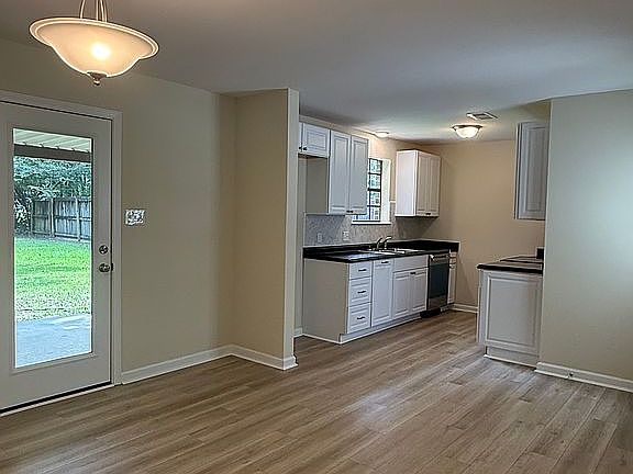Newly renovated home which is move in ready. New floors and carpet, interior is freshly painted. New cabinets in kitchen and bathrooms. Kitchen has new appliances throughout. New toilets and tub surrounds. Outside has new vinyl siding, shutters and a new roof. There are two large storage buildings in the back yard for household storage and maintenance. Electric water heater, air conditioning and heat. Fenced yard with large oak trees in front and rear. Not in flood zone and did not flood in 2016.