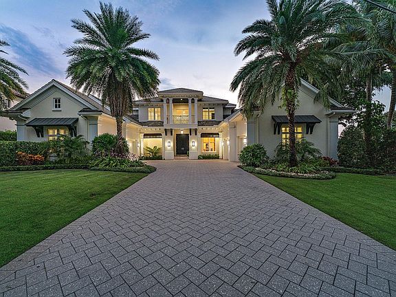 Welcome to your dream waterfront estate! This exquisite 5-bedroom + den, 6.5-bath residence is a masterpiece of luxury and comfort, nestled on over half an acre with 135 feet of direct Intracoastal Waterway frontage. Designed for the discerning homeowner, this property boasts a 4-car garage and a private dock with a 20,000 lb. lift--perfect for the yachting enthusiast, offering easy ocean access with no fixed bridges. Step inside to discover a chef's paradise in the gourmet kitchen, featuring a gas cooktop, expansive countertops, dual sinks, and a wine cooler, all adjacent to a cozy casual dining area. For more formal occasions, the elegant dining room awaits. The home also includes a family room and a formal living room, providing ample space for entertaining. Plus, there's a wine room. The first-floor master suite is a sanctuary, complete with his-and-hers closets, a breakfast bar, an office, and a lavish en-suite bathroom. Each of the remaining bedrooms also features its own en-suite bath, ensuring privacy and comfort for all.