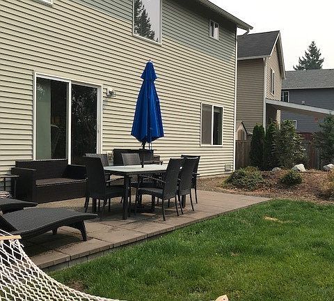 Beautiful 2,512 SF home with living room, family room and a flex room! Newer flooring! Master suite with 5 piece bath and walk-in closet. Kitchen with upgraded stainless appliances, beautiful cabinets with pullouts and granite countertops. This home is equipped with a sprinkler system, alarm system and wired for surround sound. Recently landscaped backyard with fire-pit. Move-in ready! Near shopping and JBLM.