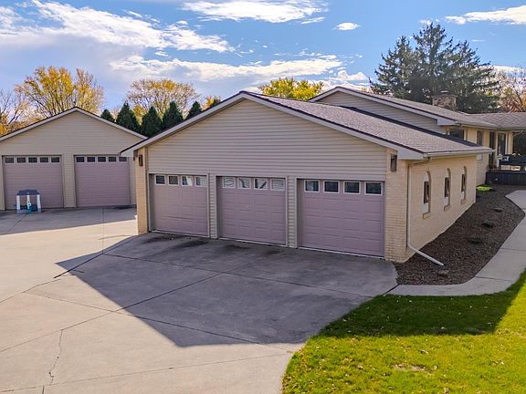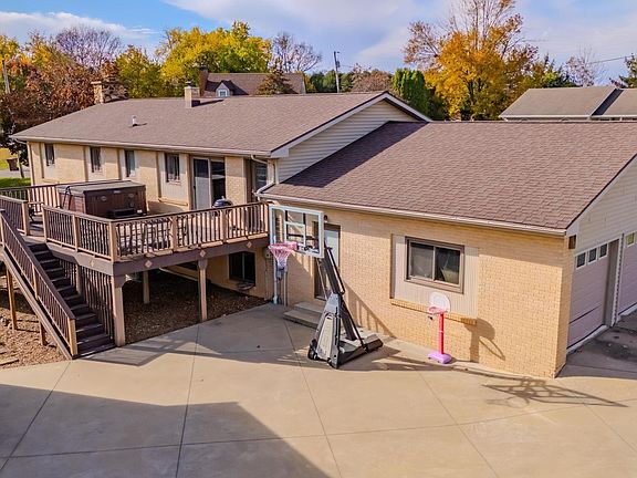 Everything you’ve been searching for! This spacious 4-bedroom, 2-bath brick ranch offers over 3,100 sq ft of finished living area including a full daylight walkout basement. The custom kitchen features granite countertops, tile backsplash, stainless appliances, and abundant cabinet space, opening to a formal dining area. The main level also includes a large living room plus three bedrooms and a full bath. The lower level offers an expansive family room with a brick gas-log fireplace, built-in bar, projection TV and wide screen (to remain), along with a 4th bedroom, full bath with walk-in shower, and a large laundry/storage area. Enjoy outdoor living on the covered front porch or the elevated 16’x28’ Trex deck complete with hot tub. The attached 3-car garage includes built-in cabinetry and counter space, while the impressive 30’x30’ detached garage/workshop offers two 10’x10’ overhead doors, insulated metal ceiling and vinyl walls, mini-split heating and cooling, and a room plumbed for a half bath. Concrete drive and excellent curb appeal—ideal for anyone needing extra garage, hobby, or workshop space! Bar stools, Security cameras, freezer in garage excluded.