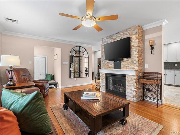 Step through the front door into a welcoming foyer that opens to a bright, spacious living room filled with natural light. A beautifully crafted stone fireplace with custom mantle serves as the centerpiece, while dual entryways lead to the expansive eat-in chef’s kitchen. Here you’ll find custom cabinetry, abundant storage, new appliances, and vibrant illumination from recessed LED lighting and a skylight above. The kitchen easily accommodates a six-person dining table and provides direct access to a large backyard entertaining deck with a roll-up awning—perfect for outdoor gatherings.