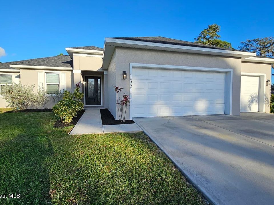 Welcome to this beautifully designed Contemporary Florida home built with comfort, efficiency, and modern style in mind. This 3-bedroom plus den/flex room (possible 4th bedroom), 2-bath, 3-car garage home features a bright open layout with vaulted ceilings and abundant natural light. The kitchen offers stainless steel appliances, soft-close cabinetry, and a large island perfect for entertaining. The split floor plan provides privacy for the primary suite with dual walk-in closets, double vanity, and walk-in shower. Enjoy outdoor living on the covered patio overlooking a spacious, manicured backyard with room for a pool or garden. Built with energy-efficient block construction, storm protection, and modern fixtures, this home offers both comfort and peace of mind. Located on a quiet east-west street near Bayside Lakes, schools, dining, and I-95, this move-in-ready gem combines curb appeal, quality finishes, and low-maintenance Florida living.