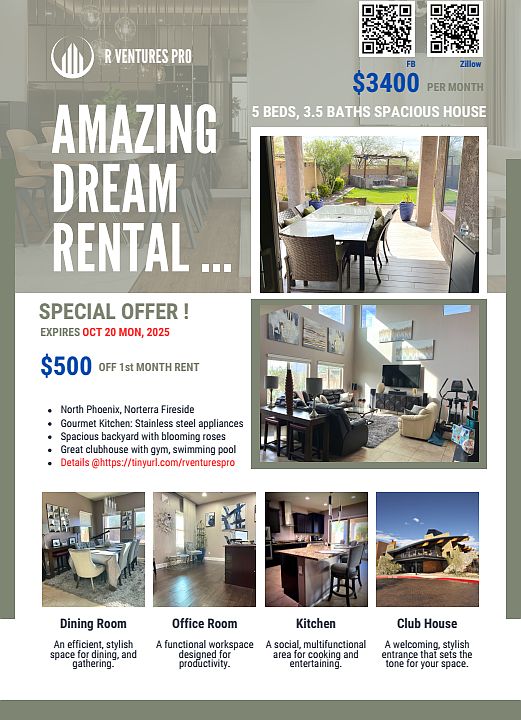 Welcome to your dream home! This beautifully designed 5-bedroom, 3.5-bathroom house combines modern amenities with timeless elegance, offering everything you need for comfortable and luxurious living. Conveniently located in a sought-after neighborhood of Phoenix, this home is perfect for families, professionals, and anyone looking for a spacious, stylish retreat.