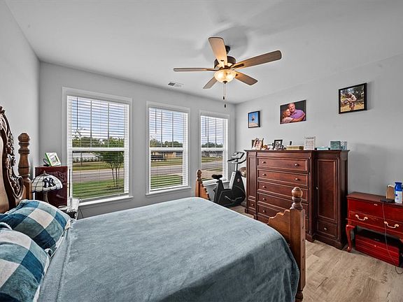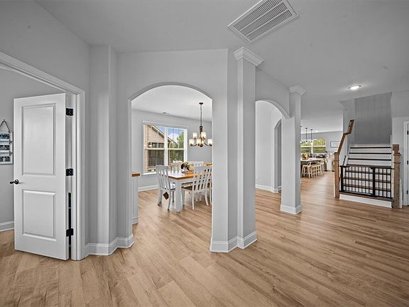 The second-level primary suite is a private sanctuary, boasting multiple walk-in closets and a spa-like en-suite bathroom with dual vanities, a tiled walk-in shower, and elegant finishes. Four additional bedrooms, one on the main level and three upstairs, with access to well-appointed full baths, provide ample space for family, guests, or a home office. A versatile loft area upstairs serves as a flexible space for relaxation, play, or hobbies. Luxury vinyl plank flooring, ceramic tile, crown molding, and recessed lighting throughout reflect the home’s many upgrades, blending style with durability.