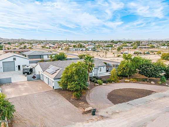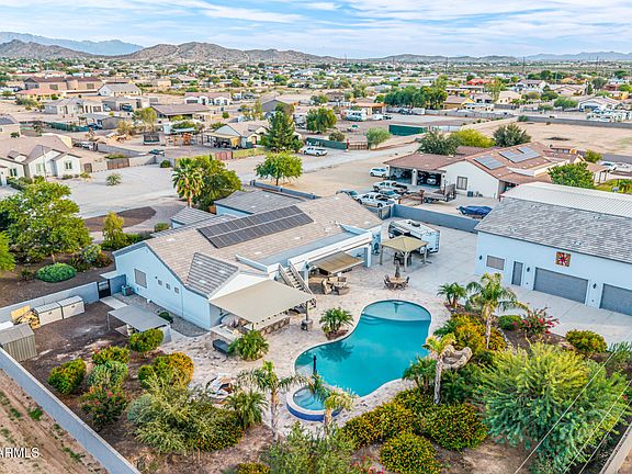 This stunning custom-built home surrounded by the Estrella Mountains and Sonoran Mountains is sure to impress with the ability to entertain guest and offers privacy on the 43,745 square foot lot. Truly seamless indoor-outdoor living includes features of an outdoor kitchen & grill with custom built lanai, gazebo and sparkling pebble Tec pool and spa both which can be heated. Custom waterfall feature also includes a water slide, fun for the family! As you enter the property there is an abundance of parking in both the circle driveway or the extended driveway leading to this beautiful custom home or through the custom-built gates to the 40x60 RV garage. gourmet kitchen, oversized lanai that is highly detailed. The main residence includes over 4000sf of living space. The solar system is free and clear. Utilities are roughly $200.00 month. This beautiful home includes 4 bedrooms and 3 full bathrooms with upgrades throughout this lovely home. Granite countertops accent the kitchen island with walk-in pantry, additional pantry space with double French doors for extra storage space in the main hall area. Top of the line Samsung appliances including gas range with 4 large gas burners with griddle feature. The range can also be converted back to electric. Enormous farmhouse sink with views to the backyard sanctuary. Separate island and under cabinets include pull outs offering easy access to all the necessities for the Chef! Newly installed custom French doors enhanced with stained glass offer privacy from the exterior of the patio. Both main bathroom shower and guest bathroom shower are completely remodeled with upgraded hardware, folding shower chairs, main shower is oversized with handicap accessibility and bar features.