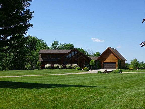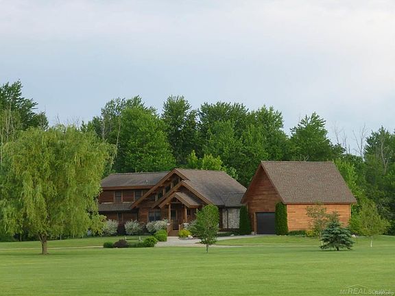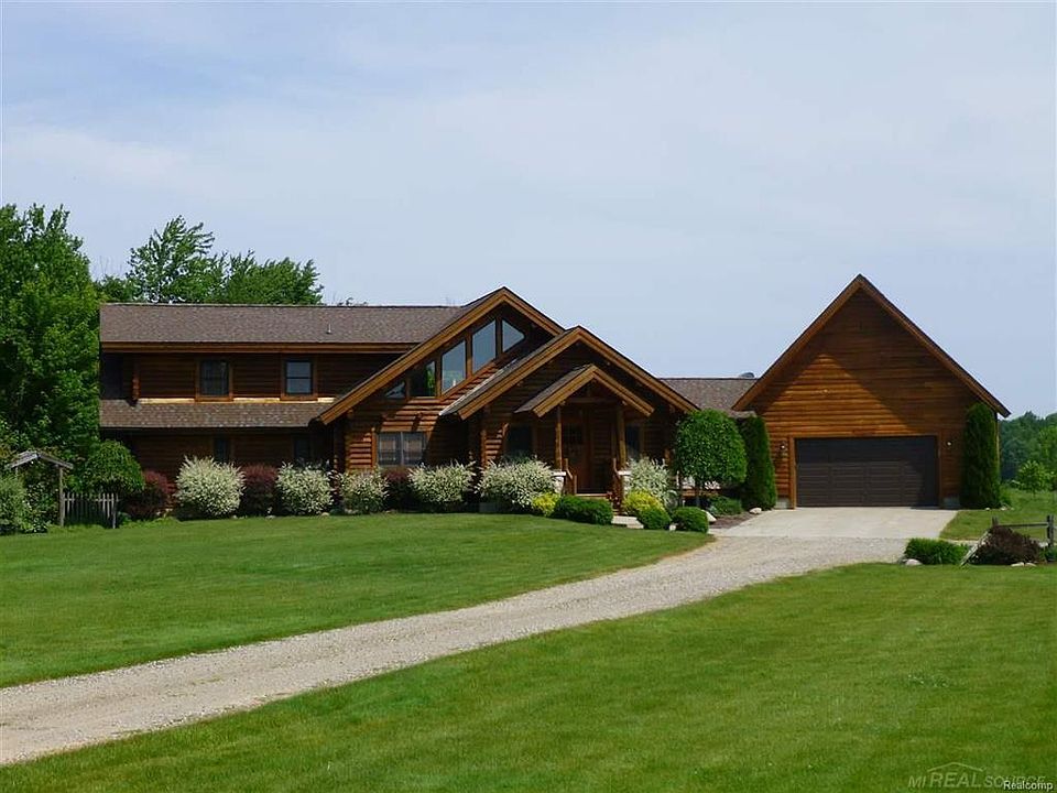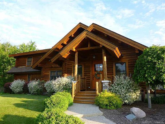 You will be ready to move when you see this stunning custom built "Rocky Mountain Log Home" situated on 5 acres. This true log home is constructed with 8' logs from Montana. Home is located on a dead end road and backs up to 80 acres of non-buildable land. Enjoy the spacious Great Room with gas fireplace and exquisite moose antler chandelier. Master Bedroom is on the main level with doorwall to patio, private bath and walk-in closet. Custom half bath with barn wood and specialized antiques for unique feel. Upper level offers 3 bedrooms, loft sitting area and full bath. Finished basement has an entertainment space, workout area with plumbing, office and full bath. Pole Barn is 40'X60' with cement floor, electricity, over sized 10' door and indoor/outdoor dog pen. Enjoy the beautiful backyard with sound system on patio and pergola. Pond has great beach area with swim deck. Pergola includes electricity so it can be decorated. Keep your pets safe with the underground pet fence.