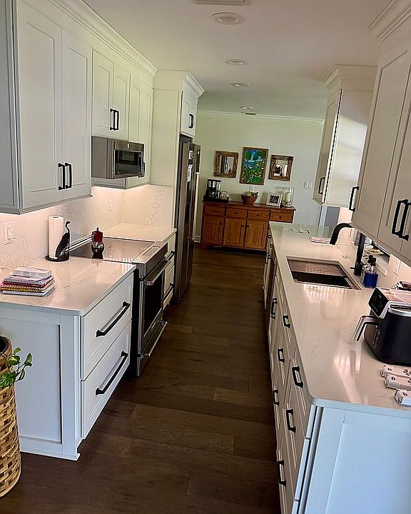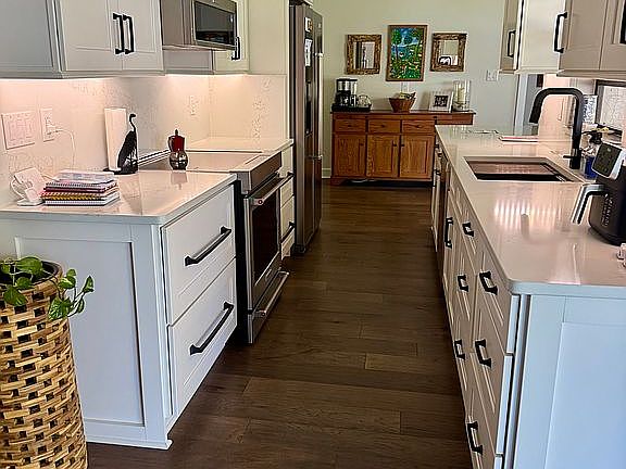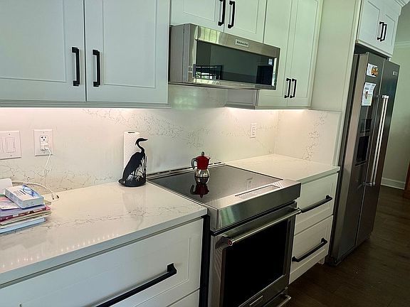 Step inside to discover rich hardwood floors, brand-new custom cabinetry, designer fixtures, trim, and sliding glass doors that flood the space with natural light and stunning lake views. The kitchen is a showpiece, featuring quartz countertops, premium stainless steel appliances, and an oversized breakfast bar perfect for entertaining.