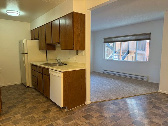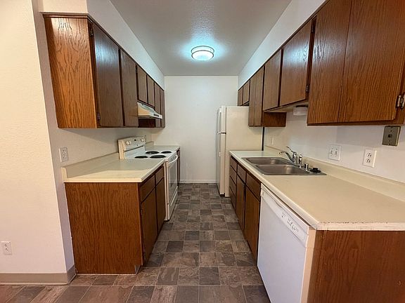 This 1-bedroom, 1-bath unit is located on the second floor of the Sunnyslope Condominiums. The kitchen features a practical galley-style layout with abundant cabinet storage, matching white appliances including an electric range, dishwasher, and refrigerator and ample counter space with a double-basin sink. Warm wood cabinetry pairs with neutral countertops and flooring for a clean, easy-to-maintain look. Overhead lighting brightens the space, creating a functional area for everyday cooking and meal prep.