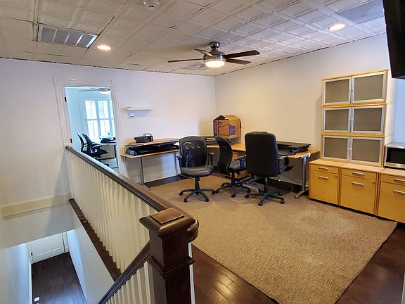 The layout features two private offices for focused work or leadership use, along with a shared open office area perfect for collaboration. The space comfortably accommodates at least five employees while still providing ample room for client meetings and small gatherings.
