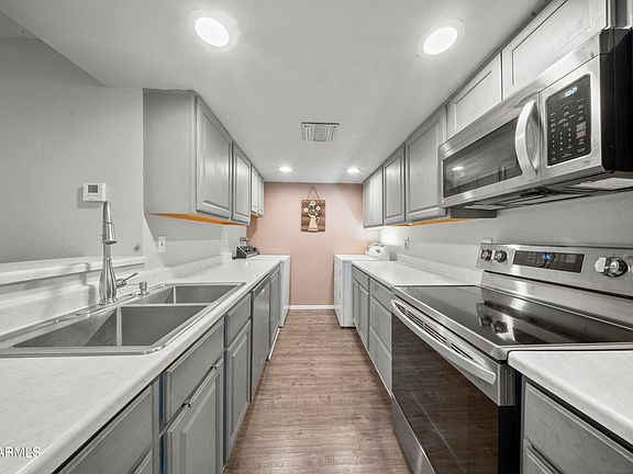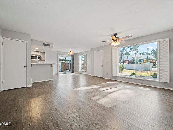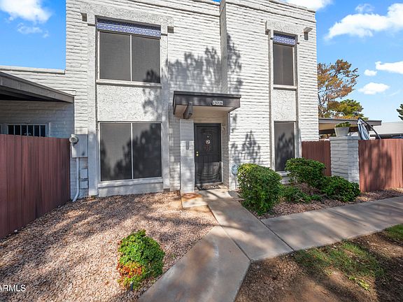 Welcome to this move-in ready 2 bed, 1.5 bath home in Gold Key Racquet Club Townhomes. The open downstairs floor plan has new wood laminate flooring and new sliding doors that open to a private courtyard. The kitchen shines with stainless steel appliances and an in-unit washer and dryer, and the bathrooms are fully updated. The two bedrooms upstairs are spacious and have mountain views. Save on utilities with all-new dual-pane windows and slider, sunscreens, and a 2023 HVAC system. Your covered parking space includes a storage closet. The HOA covers water, sewer, trash, insurance, and exterior maintenance. Nestled near the Phoenix Mountain Preserve, with hiking and equestrian trails, yet minutes from dining and shopping, this home is a true gem.