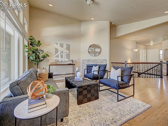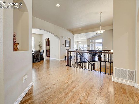 This incredible home is breathtaking from the moment you walk in the door. The front foyer invites you in with large plank hardwood flooring and natural light beaming from the picturesque windows. Just off the foyer a bedroom that may be utilized as an office is perfect for the work from home individual. The open concept floor plan flows from the foyer to the formal dining room in through the eat in kitchen and around to the living room. The cozy living room is centered around a beautiful fire place and mantle. Just off the living area the stool height breakfast bar makes the area perfect for entertaining. Stone counter tops, stunning cabinetry, and stainless steel appliances make the kitchen pristine. The informal dining area walks out to the lovely back yard and patio, perfect for summer bbq'ing. The main floor also features the master bedroom with walk in closet and five piece ensuite bath featuring a garden tub, luxurious shower, and beautiful countertops for the double vanity. The basement level has a large family room featuring a theater style projection screen and wet bar with a wine fridge. The basement has four spacious bedrooms just off the main area with two full size bathrooms. This fabulous home is located in the amazing Stonebridge at Meridian Ranch community with amenities galore. Walking distance to schools, hiking/biking trails and pools/parks. Community includes neighborhood schools, over 500 acres of parks/trails/open space, a golf course, access to pools and dog park. Recreation center houses a fitness center, basketball and volleyball courts, and also regularly hosts classes and events for all ages. In the summer months, catch a neighborhood concert, festival or enjoy other regular community events. This community has it all.