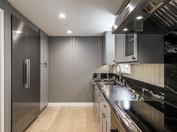 The chef's kitchen is equipped with top-of-the-line Miele appliances including induction cooktop, oven, and an impressive 48'' refrigerator/freezer set against granite countertops, a Rohl farm sink, custom cabinetry, and a walk-in pantry. Designed for relaxation and entertainment, the home features a SONOS surround sound system, a 75" Sony Bravia TV, and open living spaces that flow seamlessly outdoors.