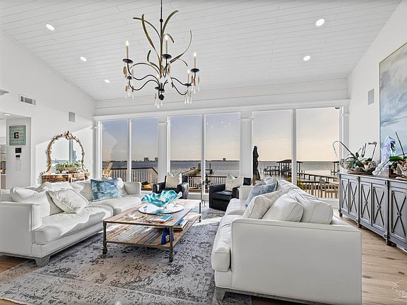 This is a rare opportunity to own a premier deep-water estate in Gulf Breeze Proper. Situated on 1.5 acres with over 200 feet on the Intracoastal Waterway, this stunning property features a rare 20x50 ft deep-water boat slip (9 ft depth) with flow-through dock and sun deck, a private white sand beach, and expansive green space. The home offers luxury throughout, including a great room with expansive windows showcasing breathtaking water views, a vaulted ceiling, and a gas fireplace. The custom kitchen is equipped with high-end appliances, a wet bar, and a dining area overlooking the Sound. The primary suite offers panoramic water views, deck/hot tub access, dual walk-in closets, and a spa-style bath with a soaking tub and separate shower. A main-level guest suite includes a private bath and patio access. Upstairs, you'll find two additional bedrooms, two full baths, and a large multipurpose room with a fireplace and French doors for added privacy. Additional features include a 3-car garage with a climate-controlled, large bonus room and half bath, plus a 200x200 ft vacant lot across the street included in the sale. Exceptional views, luxury finishes, and rare boating access make this a one-of-a-kind waterfront offering the ultimate Florida lifestyle.