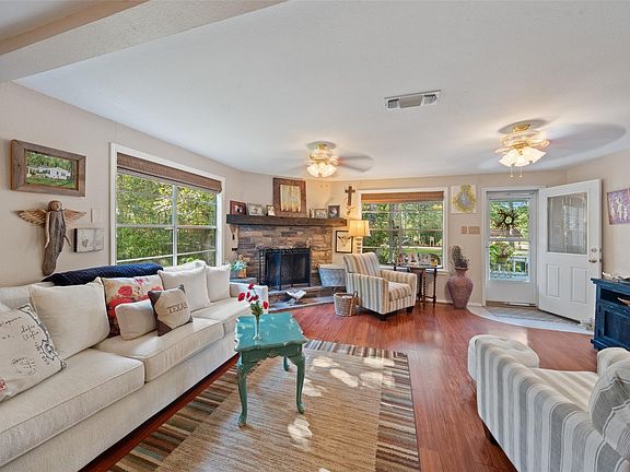 Sweet farmhouse vibes with a forever lake view! This cozy one-story 2 bed / 2 bath (1,276 SF) in Lake Forest Falls sits right across from the water—framed by a wide covered front porch made for rocking chairs and morning coffee. Inside, the easy, open layout gathers around a freestanding fireplace, warm plank flooring, and a kitchen that feels like home—breakfast bar and soft-close cabinets. Two comfy bedrooms, two full baths, and in-house utility keep life simple. Big-ticket updates—roof, HVAC, and water heater (per seller)—mean move-in ready. Out back, a private wrap-around patio (side + rear) sets the stage for string lights, grilling, and slow weekends. Covered carport plus extra parking. Low taxes and a quiet, quaint community with subdivision lake access—boat ramp, picnic area, and stocked pond. Minutes to restaurants, shopping, marinas, and I-45. Perfect as a full-time nest, weekend farmhouse, or vacation rental (buyer to verify). Public water + septic. Come exhale.