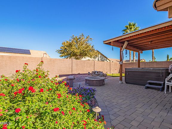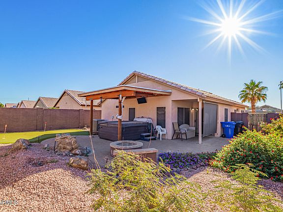 Cute 3 bedroom, 2 bath, 2 car garage home with backyard featuring pavers, fire pit and a putting green. Warm and inviting living spaces with wood-look flooring, vaulted ceilings, arched passageways, and a soothing palette that makes you want to stay. Whip up your signature dishes in the well-appointed kitchen, equipped with oak cabinetry, ample counter space, built-in appliances, and a pass-through window. The primary bedroom overlooks the back yard and features a remodeled tiled walk in shower and a walk-in closet. Out back, you'll have plenty of space for outdoor fun, including a cozy covered patio, a nice seating space with pavers and a putting green. Hard to find price point in Surprise!