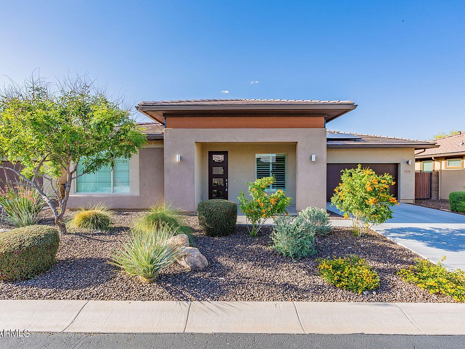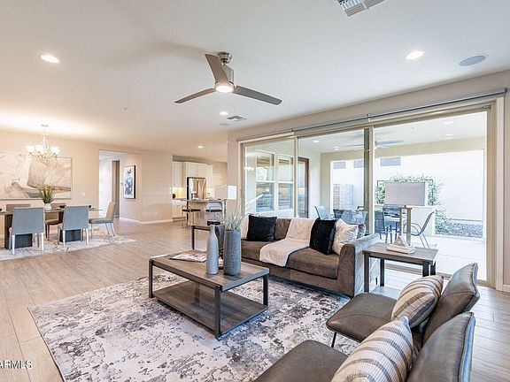 Discover the epitome of luxury living in this stunning Clarity floor plan offering 2 primary bedrooms, 2.5 baths, plus a spacious den, nestled within the prestigious gated active adult golfing community of Trilogy at Vistancia. Situated on a desirable N/S exposure lot backing to a common area, this single-level residence boasts energy-efficient solar, all new window coverings, and a Pelican whole-home water system, offering both sustainability and comfort. As you step inside, you'll be greeted by gorgeous wood-like plank flooring, a neutral color palette, and an inviting great room with seamless flow into the chef's eat-in kitchen. Recently updated with a GE Elite series refrigerator, the kitchen features SS appliances, elegant white cabinets with under-mount lighting, stunning granite countertops, and a center island with a breakfast bar, perfect for culinary enthusiasts. Triple-pane nested glass sliders open the interior space to the stunning tranquil desert environment of the backyard oasis. Here, you'll find a built-in BBQ, paver patio for dining alfresco, and recent updates to the landscaping complete with sunshades and turf. Retreat to the first primary bedroom offering an ensuite bathroom with an oversized walk-in shower, dual sinks, private toilet, and a large walk-in closet. The secondary primary bedroom boasts its own ensuite full bathroom with a shower/tub combo, while a powder room and laundry room, including newer GE Elite series washer and dryer, add convenience. The 2-car garage now features a utility sink, making cleanups convenient and easy. Enjoy the proximity to the Mita Clubhouse, resort-style heated pools, tennis courts, bocce ball, fitness centers, meeting/game rooms, golf course, dog park, and more! Experience luxurious living at Trilogy at Vistancia. Submit your offer today!