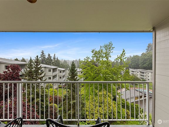 Welcome to the best and brightest unit at Bridgehaven! This updated 2-bed, 2-bath, 1,415 sq ft condo features an open living/dining area with vaulted ceilings, skylights, and a private deck with views of the Cascades, pool, and manicured campus. Mid-century modern styling with fireplace and wet bar. Full-size, in-unit washer and dryer. New paint and lighting plus laminate flooring. Primary suite offers double closets and an updated full bath. Second bedroom is perfect for guests or an office. Main bathroom is also remodeled. Two covered parking spots. Amenities include a heated pool, hot tub, sauna, and clubhouse. Walking distance to Jackson Park Golf Course, trails, shops, restaurants, and the upcoming 130th St light rail station.