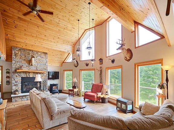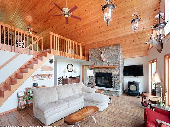 Set on 125 private acres in the Catskills, this retreat offers both seclusion and comfort. A long wooded drive leads to a 3-bedroom home with a wide deck overlooking the swimming pond and long valley views with mountain vistas. Rich with natural features including a spring-fed swimming pond with a dock, plus a picturesque waterfall located just beyond the property line—perfect for nearby outdoor adventure and quiet reflection. The expansive house features a double-height great room, in-floor radiant zoned heating, a wood-burning fireplace, and an auxiliary pellet stove for added warmth and efficiency. Whether you're seeking a year-round residence or a weekend escape, the property's balance of wilderness and comfort makes it a rare find. Just 40 minutes from popular ski mountains and about 3 hours from New York City, it offers the ideal upstate getaway.