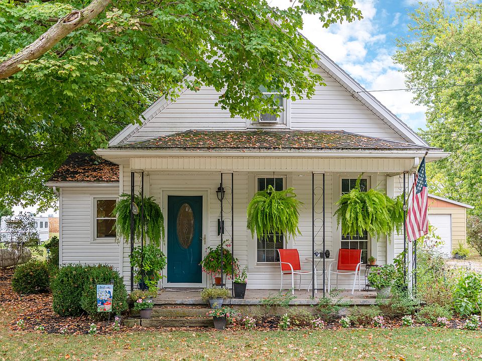 This charming home invites you to relax and enjoy its peaceful setting, whether it's from the covered front porch overlooking vibrant, colorful flowerbeds or in the private backyard, where you can take in gorgeous sunsets each evening. Situated on a spacious .75-acre lot just north of Urbana, in the West Liberty School District, this property combines country living with the convenience of being close to town for shopping, dining, and everyday needs. Inside, the home offers nearly 1,200 square feet of updated living space across two floors, featuring 3 bedrooms and 1 full bath. Step into the large foyer that leads into an oversized living room with gleaming hardwood flooring, perfect for both family gatherings and quiet evenings at home. The kitchen is warm and inviting with white cabinetry, a decorative backsplash, and abundant counter space. A wall of windows at the back of the kitchen frames a stunning view of the backyard and nightly sunsets. All kitchen appliances convey, including the range, side-by-side refrigerator, microwave, and dishwasher, making it move-in ready. Convenience continues with a main-level laundry room, where the front-loading washer and dryer stay with the home. The main level also includes a cozy carpeted bedroom and a full bath featuring a decorative double-sink vanity and a whirlpool tub, perfect for relaxing at the end of the day. Upstairs, you'll find a loft style bedroom at the top of the stairs, which flows into a third bedroom, providing flexible space for guests, a home office, or a playroom. The full basement offers ample storage, while outside you'll find even more to appreciate. A two-car detached garage, with plenty of additional off-street parking, and also the property includes a 16x22 outbuilding that, with a little repair, could be ideal for storing lawn equipment, mowers, or even a workshop. This property truly has a lot to offer and is move-in ready, combining modern updates with the charm of a country setting.