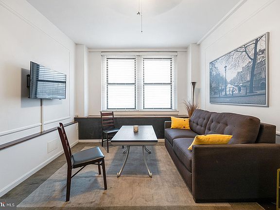 Experience the charm of this beautifully renovated, pet-friendly Studio furnished with a versatile sofa bed, an extendable dining table accompanied by two chairs, a wall-mounted TV, a freestanding bookshelf, area rugs, wall art, and decorative woven bamboo lamp. (Red lamp not included). The Monthly HOA fee INCLUDES Electric, Water, Heat, Internet, 24-hour front desk, emergency service, and CCTV security, an on-site management, common areas maintenance, building insurance, and snow removal - ensuring a hassle-free lifestyle .…… Just pack your bags and move in, use it as a primary home, Pied et Terre, or as an investment ……… This residence showcases contemporary elements, including painted concrete flooring, custom-made storage compartments, ceiling light fan, industrial style wall mount shelving, two expansive windows boasting stunning Northern city views, an in-unit air system, radiator heat, and a closet complete with a full-length inlay mirror. The kitchenette is equipped with sleek wooden cabinetry, a two-burner cooktop with a vent hood, a modern tiled backsplash, and a stainless steel mini-fridge. The tiled bathroom features a newly reglazed tub with a shower, a vanity for additional storage, and a mirrored medicine cabinet ………… The Arts Condo, a pet-friendly, 16-story high-rise located in the heart of Center City offers secured access entry with wheelchair accessibility, a 24-hour front desk concierge, fitness center, community room, and emergency maintenance, an on-site professional management, a grand lobby with business terminals, a card, and mobile app operated laundry facility, and bike storage (added fee) ………… Located between the hip and trendy Midtown Village district and the famed Avenue of the Arts, you will be immersed in the center of it all. Walking distance to Center City's dining, businesses, shopping, luxurious parks, theaters, top Universities, Jefferson University and Hospital, with a quick commute to South Philly’s Italian Market, the eateries along Passyunk Sq., the Sports Complex, and Live Casino. All forms of public transportation and multiple parking options are right outside your door with easy access to major highways. At The Arts Condo, there is nothing out of reach!! * Unit, Furniture, and appliances sold AS/IS. 1 Pet per unit. Dog max 40lb non-aggressive breed or 1 cat.