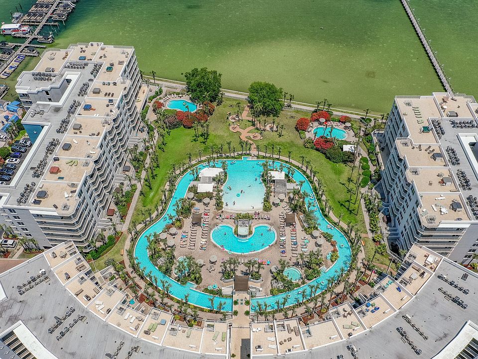 Seasonally heated waterfall poolLazy river lagoon poolViews of the bayMarina with dockHot tubsZero entry poolBeautiful lush landscaping