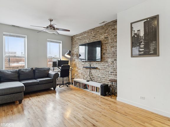 Newly renovated 1 bed | 1 bath condo on the top floor of an intimate condo building in the heart of Noble Square! Enter through a welcoming foyer where you're greeted with soaring 12 foot ceilings, two entry closets, and gleaming hardwood flooring throughout the living, kitchen, and dining area. A newly renovated kitchen boasts all stainless steel appliances, white quartz counter-tops, an island/breakfast bar, and lovely white cabinetry. The main living area boasts an open floor plan with space for formal dining, a charming exposed brick wall, and large N/E windows flooding the home with natural sunlight. The primary bedroom, off of the main living area, boasts incredible sunlight and new mirror closet doors with ample storage. The home is complete with a renovated bathroom, offering a new vanity, medicine cabinet, toilet, and updated tiling/flooring throughout. Unit comes with private storage, Nest thermostat, intercom system, and free shared laundry in the common area. Additional building updates include electric throughout (400 amp), updated fire escapes, added a Ring security camera, and new HVAC ductwork. Building is also currently updating back door lock/handle system, (not a special assessment). Building rental restrictions are no less than 6 MO lease and no AirBnb's, but no rental cap. Ideal location, just a stone's throw from Chicago Ave CTA, Eckhart Park, Motley Elementary School, Coal Fire, Urban Market, and all that the Noble Square shopping and restaurant scene has to offer!