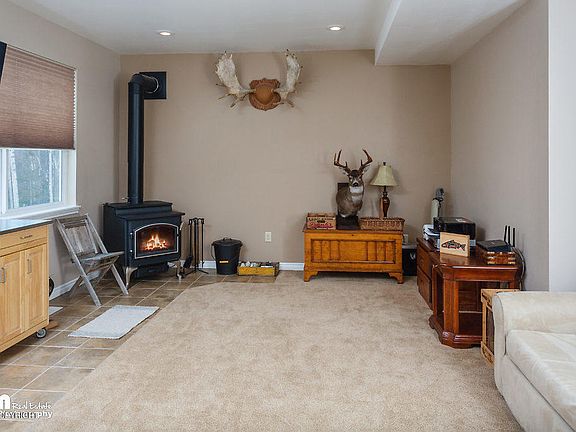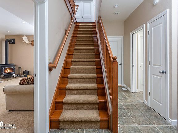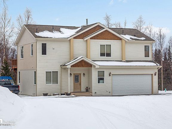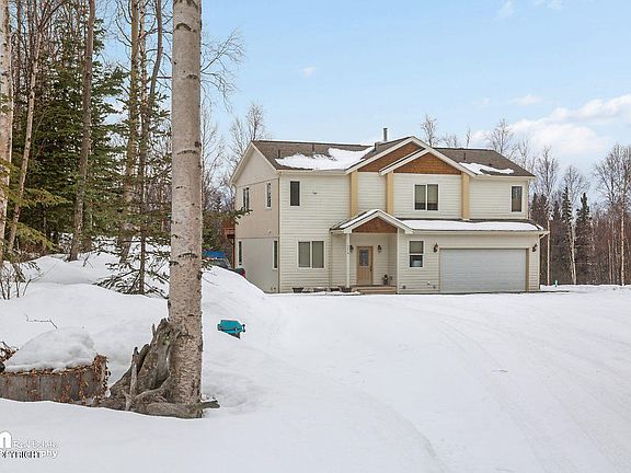 Stunning home! Custom trim in the kitchen, Brazilian Cherry hardwood flooring, Spare room and Master bedroom on top floor master has a soaking tub, large closet, dual vanity. Large living room with fireplace and access to private deck. 2 bedrooms downstairs, plus family room with a wood burning stove for those cold winter months in Alaska. Huge garage, beautiful wooded setting.