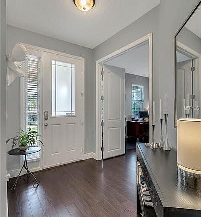 Welcome to this meticulously maintained and totally upgraded 3 bed 2 bath home with den, and rear entry two car garage. When you arrive youâll notice the fully fenced corner lot, perfect for kids and pets. The foyer opens to the den through double door entry, which can be used as an office, playroom or converted to a bedroom. The open living area features wood floors with views to the patio and backyard. The kitchen includes large cabinets, stainless steel appliances, granite countertops, tiled backsplash and eat-in bar. The master suite features dual vanity, glass enclosed walk-in shower, and separate water closet. The backyard is an outdoor paradise with huge patio surrounded by artificial turf, with a large side yard with citrus trees. Located close to shopping, dining, great schools, Disney and the attractions with easy access to major roadways. This home also uses solar panels! Other upgrades include custom closets, garage insulation, heat reducing windows, and more! Click on the Virtual Tour for more and call now to schedule your showing!!!