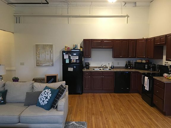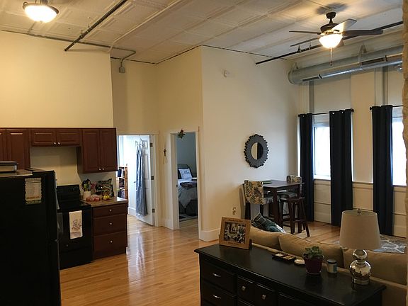 Located on the third floor of the former school building, this apartment has 12' tin ceilings, an open living/kitchen space, large bathroom, and two nice sized bedrooms. The laundry area is ready for your stackable washer and dryer and the bathroom is large with space for linen storage. The apartment is on the SW corner of the building, which lets a ton of natural light into your space via the 8 windows. Photos are from previous tenant, apartment not furnished. The Vanville Apartments are nestled into Downtown Bloomer within the former middle school. Built in 1921, this building has tons of character with high ceilings and wide hallways. The gymnasium has been converted into indoor parking for all residents.