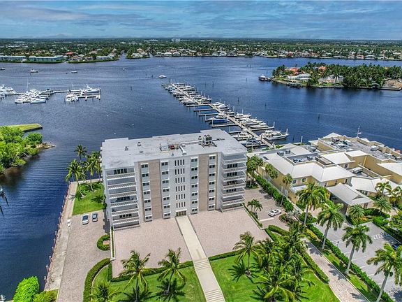 RARE FIFTH FLOOR corner residence in iconic Bay Terrace, the mid-century gem with direct frontage on Naples Bay, and the only high rise in Olde Naples. Bay Terrace is your only opportunity to live above the third floor in Olde Naples. This light and bright home showcases panoramic water and city views from Golden Gate to Marco Island. Enjoy downtown living, convenient boating and ever changing sunrises from this home, with its great location, private docks and eastern exposure. The location, steps to the Naples Yacht club, offers an easy walk to the City Dock, the exceptional restaurants and shops of Third Street South, and Naples stunning beaches. Owners enjoy guest suites for extended family and friends, boat slips for annual lease, secure under building parking, and indoor storage. A 24 hour on-site manager, electric, A/C, heat, water, sewer and basic cable are included in the quarterly condo fee.