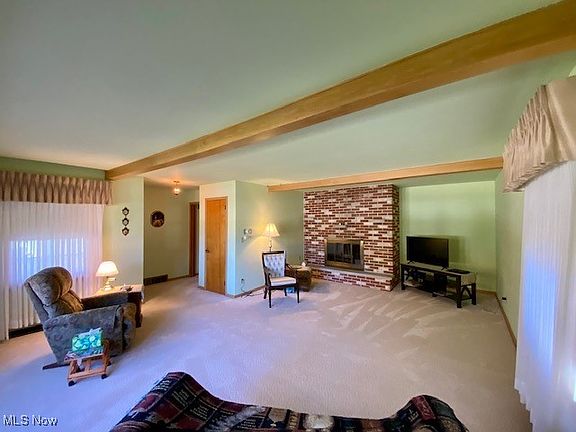 Welcome to this well-maintained three-bedroom, one-and-a-half-bath brick ranch situated on a corner lot. Step inside and you’ll immediately notice the care and cleanliness throughout—Mrs. Clean truly lives here! The home features an oversized living room highlighted by a beautiful brick wood-burning fireplace, perfect for cozy evenings. The kitchen offers an island and overlooks the dining area with sliding doors leading to a covered rear patio, ideal for relaxing or entertaining. Additional highlights include a two-car attached garage and first-floor laundry capability in the spacious pantry area. The full basement offers a second wood-burning fireplace, plenty of storage, and potential for a finished rec room or hobby space. Updates and features include: New roof (2018), New windows (2017), New hot water tank (2023), HVAC system serviced twice yearly (spring and fall). The basement was externally waterproofed around 2008. Low utility costs & security system for budget-friendly living. All appliances stay, including a stove (approx. 2 years old), refrigerator (approx. 7–8 years old), and washer (10 years old) & dryer (2 years old) This home has been gently lived in and lovingly maintained—move right in and make it your own!