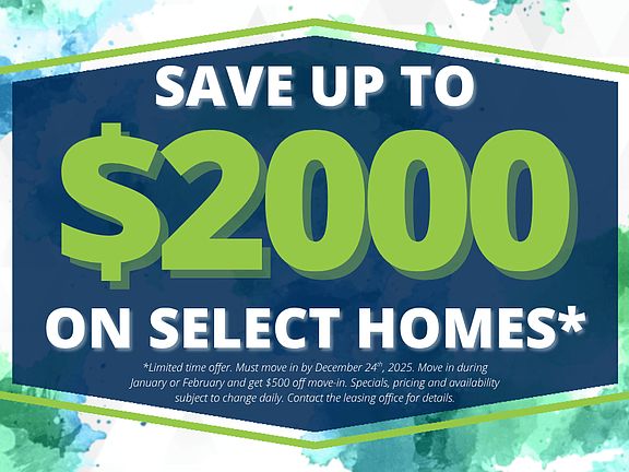 - Special offer! Save up to $2000 on Select Homes! *Limited time offer. Must move in by December 24th, 2025. Move in during January or February and get $500 off move-in. Specials, pricing and availability subject to change daily. Contact the leasing office for details.