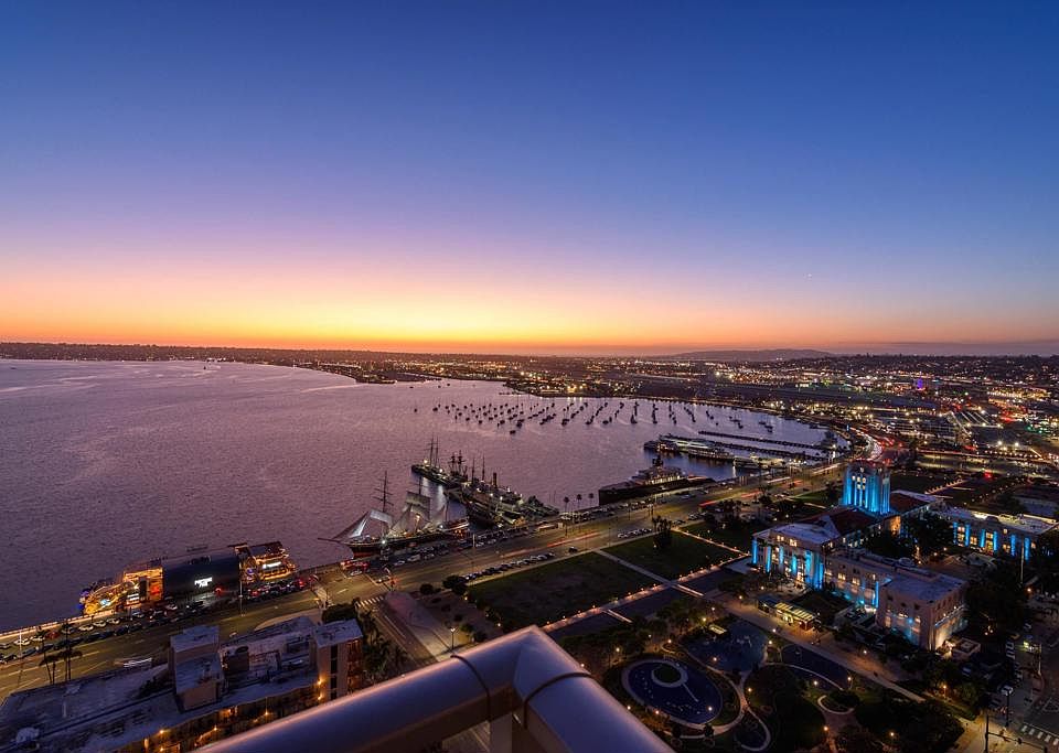 Immerse yourself in the epitome of luxurious living with this breathtaking corner residence spanning over 3,150+ Sq Ft. on the 34th floor, offering unparalleled vistas that extend beyond the horizon. Nestled in the heart of Downtown San Diego, experience the perfect blend of urban convenience and tranquil seclusion. Indulge in fine dining, vibrant nightlife, and a coastal lifestyle, all just moments away. Originally crafted as the builder's showcase, this meticulously redesigned abode now presents an expansive open layout, complete with a generously sized built-in office and two additional bedrooms. Every detail exudes opulence and comfort, from the stunning kitchen adorned with rare fossilized stone to the refined marble fireplace wall. Prepare to be captivated by the master suite, featuring a bespoke dressing room with Swarovski crystal accents and custom wood cabinetry, elevating luxury to new heights. Unwind in the generous primary suite, graced with a private balcony and a spa-inspired bathroom boasting ample storage space. Equipped with automated shades, three HVAC zones, and more, this residence epitomizes both luxury and functionality. Rest easy with the 24-hour concierge and security services, ensuring peace of mind. Indulge in an array of amenities, including a fitness center, sauna, and pool/spa, while entertaining in style with a theater room and wine-tasting room. Additional features such as a conference room, library, and outdoor barbecue areas further enhance the upscale living experience at Bayside. Welcome to your ultimate dream home, where opulence meets sophistication in an unrivaled setting. Don't miss this opportunity to embrace a lifestyle synonymous with grandeur and exclusivity.