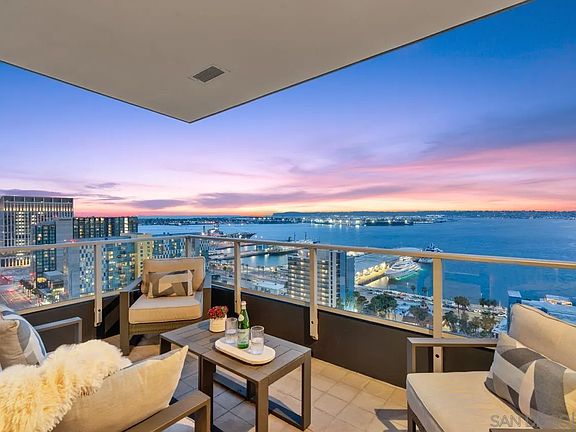 Discover The Art of Living in this beautifully appointed 2-bedroom, 2-bath + den residence, soaring above the city on the 23rd floor of Bayside—one of San Diego’s most iconic luxury high-rises. Enjoy panoramic views of the sparkling San Diego Bay, the Pacific Ocean, and iconic Coronado Bridge—perfectly framed by brand-new floor-to-ceiling windows. Unwind on one of two private patios as you take in weekly sailboat regattas, dazzling fireworks, and breathtaking sunsets that shimmer across the bay. This coveted floor plan offers refined sophistication and top-tier finishes, including whole-home Crestron UV resistant motorized blinds and a Sonos multi-zone sound system for the ultimate in comfort and control. The chef-inspired kitchen features Viking appliances, Snaidero cabinetry, and sleek finishes ideal for both everyday living and entertaining. The den/office is thoughtfully designed with custom built-ins, offering the perfect workspace or flexible bonus area. The renovated guest bath stuns with glass tile accents and a lighted vanity mirror, while the spacious primary suite provides a serene retreat. Two dedicated parking spaces include an EV charger, adding modern convenience to luxury living. Don’t miss this opportunity to own a residence where design, technology, and breathtaking views come together in perfect harmony. Welcome Home!