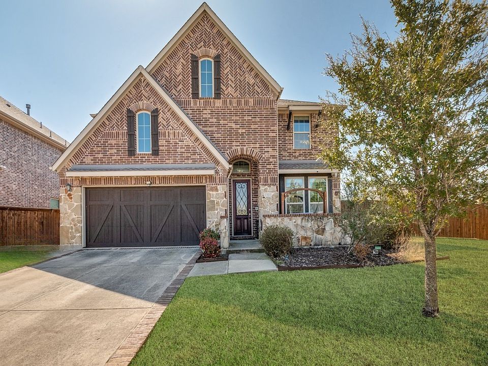 Stunning NORTH FACING two-story home nestled in the heart of Carrollton on one of the largest cul-de-sac lots in the neighborhood! A beautiful brick & stone elevation creates a welcoming first impression. Just off the entry, the formal dining room showcases rich HW floors, perfect for elegant gatherings. The spacious living room boasts soaring double-height ceilings & a cozy fireplace w-a stylish tile surround. The bright & airy breakfast nook leads into the well-appointed kitchen, featuring granite countertops, an extended island, a tumbled stone backsplash, a gas cooktop + SS apps. An intercom system connects the kitchen, bedrooms & both entry doors, allowing communication throughout the home while also playing radio stations or personal devices for added convenience. A full-size utility room offers BI cabinetry for extra storage. The primary suite is generously sized & includes a charming sitting area framed by bay windows. The en-suite bath features dual sinks, a relaxing garden tub, a separate shower & a WI closet. Upstairs, a large game room provides the perfect space for a pool table or entertainment area. Three secondary bedrooms complete the upper level—two sharing a Jack-and-Jill bath, while the third has access to a separate full bathroom. Separate thermostats for upstairs & downstairs ensure personalized climate control, with the downstairs thermostat featuring smart WiFi connectivity for modern convenience. Dual water heaters! Step outside to the expansive backyard, an entertainer’s dream w-a natural gas line ready for your grill, perfect for outdoor gatherings on the spacious patio. There's ample space for a future pool, sports court, or outdoor oasis. Additional ext. features include a hookup to easily refill pest control pipes & a front door exterior entry light w-a programmable on-and-off setting for added security & ease. This incredible home is in a prime location, just minutes from Grandscape’s fabulous restaurants, shopping, & entertainment.