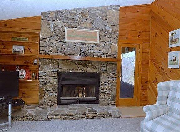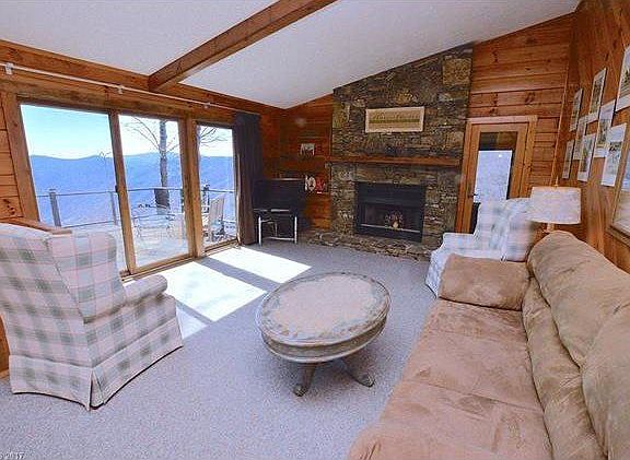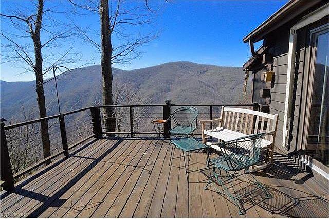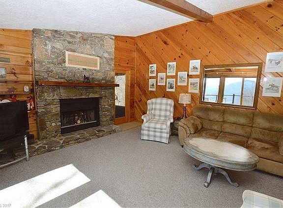 LOG CABIN with Massive Mountain VIEWS on 1.9 Private acres... perched on a knoll at the end of the road... this bright sunny log cabin has open floor plan, tons of floor to ceiling windows & big stone wood-burning fireplace.. Vaulted ceilings... Covered screen porch and deck with sunsetter awning.. 2 large bedrooms.. BEST MOUNTAIN VIEWS in Maggie Valley over looking Soco Gap.. close to Fantastic HIKING at Cattaloochie Ranch & Snow Skiing, the Swag, Great Smokies National Park.. Garage in basement & additional workshop. Excellent Vacation Rental potential.