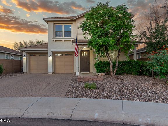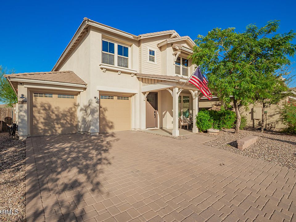 Featuring a 3-car garage w/ Tesla charger, paver driveway, and inviting front porch. Step inside to an open layout drenched in natural light that includes a gourmet kitchen with luxury cabinetry, built-in stainless appliances, & ample counter space. The spacious living area is anchored by a cozy fireplace, with a custom built-in bookcase upstairs adding character and function. Located minutes from shopping & dining, Paloma Park & Lake Pleasant. A versatile downstairs den can easily be enclosed to create an additional bedroom, office, or private retreat.