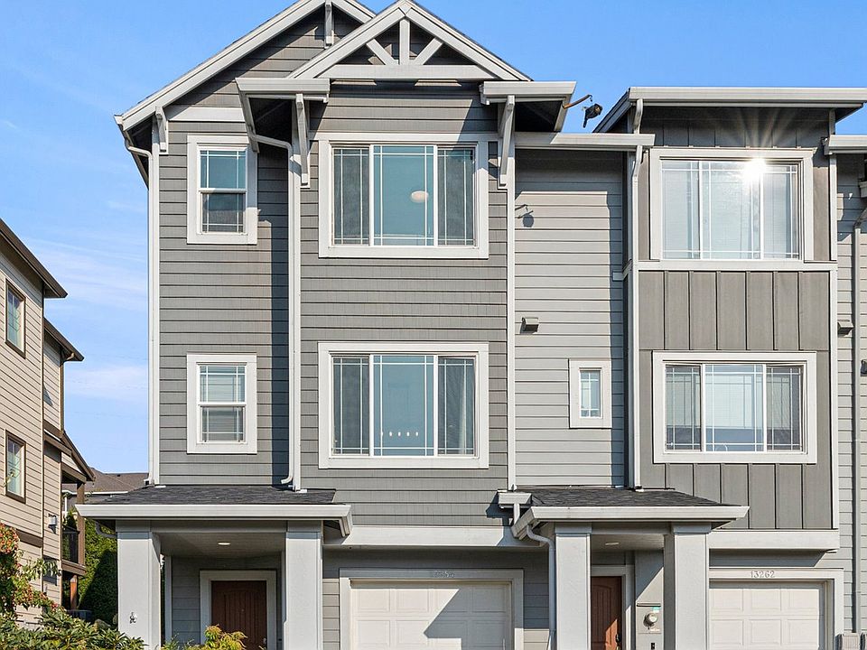 Don't miss out on this LIGHT and BRIGHT end-unit townhouse in River Terrace with open floor plan and beautiful touches throughout! The 10-ft ceilings on the entire main level and in the primary suite add to the spacious feel of this home. This home boasts a large kitchen with quartz countertops, stainless steel gas appliances, and a huge island with eating bar and ample food prep area. The living room has a gas fireplace and sliding door to large, private covered outdoor deck. The dining room provides plenty of space for a large table with chairs and sideboard, hutch, etc. The flow between the kitchen and living areas is perfect for every day enjoyment or entertaining! There is also a half bath on the main level for convenience. Upstairs is the primary bedroom with en suite bath, laundry, second bedroom and full bathroom. Also upstairs is an additional flex space - great for office, library, playroom - use your imagination! The home has been freshly painted, and has A/C, LVP flooring, window coverings, and new carpet. Some of the community amenities are pool, gym, basketball court, playground, party room, and access to co-working space. Beautiful mature landscaping, and proximity to various schools and services round out the fabulous features of this property! Seller is also offering a 1-year home warranty! Don't let this one get away!