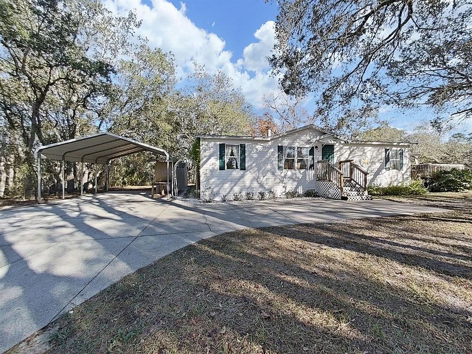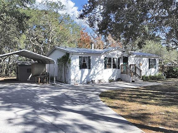 Under contract-accepting backup offers. A horse lovers dream! A mini ranch tucked away on a quiet paved road with access to gorgeous shady trails. Other farm animals welcome! This home features 3 bedrooms, 2 bathrooms and a finished laundry room with extra built-in storage. Large primary bedroom with walk-in closet (with built-in shelving) spacious en suite bathroom & linen closet. The living room has a real wood burning fireplace with an open floor plan with cathedral ceilings flowing into the kitchen and dining room. Double pane windows. Stainless steel appliances and plenty of cabinets! Outdoors you will step out onto a 20x18 deck with a large hardtop gazebo. Perfect place to unwind after a great day of riding! Off the deck is an outdoor shower with hot and cold water. No water or sewer bills! Low electric bills. New water system installed 2024. Air conditioner installed in 2019. Roof is 2019 also. Includes a 2 car carport and a fully paved large driveway for all your parking needs (including room for an RV!) The property is full of mature oak trees and is completely fenced and cross fenced and boasts an 30x18 barn. Built in 2021, this barn includes 2 stalls with automatic waterers, fans, overhead lighting, built in hay mangers, electric hook up and sliding front doors. There are gates on the back side for easy turn out convenience. Two cross fenced shaded pastures with full size water trough supplied by an automatic waterer. Fully insulated tack room which features vinyl flooring, wood paneled walls, electric outlets, full overhead lighting, & a large window to allow natural light & create cross ventilation. Large 12x10 loft above tack room for hay and additional storage. A concrete aisle runs the full length of the barn and tack room. Additional gate installed off street for easy access to the barn. There is a large area in front of barn for vets, farrier, trailer loading, etc. All barn & property gates are newer & in perfect condition/working order. Concrete wash rack with cross ties & hose hook up next to barn. Home, barn, and property have been immaculately kept up with daily care since built. 15 minutes to the Suncoast Expressway and US Hwy 19 & only 45 minutes to Tampa. Country living at its absolute best while being so close to many amenities! This is a must see, don't wait, schedule your showing today!