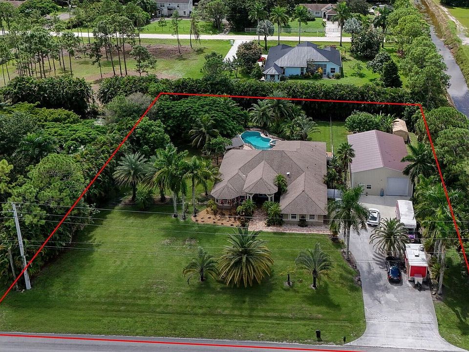 Discover a rare opportunity to own 2 buildings on 1.37 acres in a NO HOA restriction-free community. The spacious POOL home features 2 Master Suites, open floor plan, new kitchen. SUMMER KITCHEN (build in 2023) with grill, refrigerator, and keg cooler, perfect for entertaining. The 3-car garage includes a 2-car bay currently finished as an A/C flex room. In addition, a free-standing 1,700 sq. ft. insulated and fully air-conditioned building (build in 2023) with an office, half bath, WAREHOUSE space & GARAGE. Paved road access, abundant storage makes this property ideal for both personal enjoyment and business use. Great location, 5min. from brand new Publix Shopping Plaza at Avenir Town Center (Walgreens, restaurants & more) on Northlake & Coconut Blvd) A/C 2023; brand new washer/dryer & cook top; water pump 2022; swimming pool pump 2024