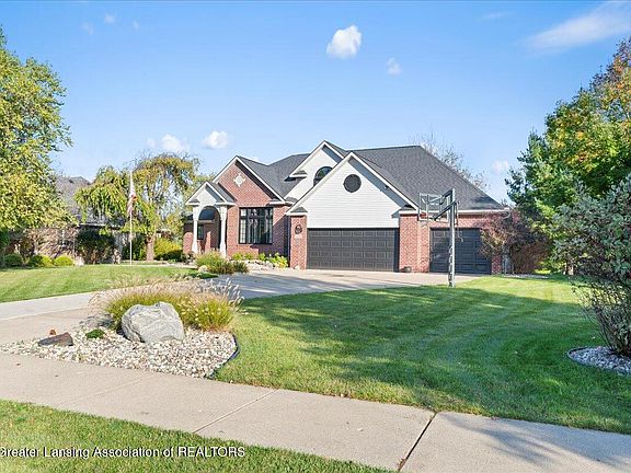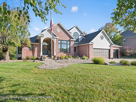 Rare opportunity in the highly sought-after Heritage Glen neighborhood within the DeWitt School District on a full acre of property with your very own pond! This stunning 4-bedroom, 4-bath executive home offers the perfect blend of beauty, privacy, and space. From the moment you step into the foyer with its soaring ceilings, you'll appreciate the open and inviting design. A versatile flex room at the front of the home makes an ideal office or formal dining area. The main-floor primary suite is privately tucked away and features a spacious ensuite bath with double sinks, a soaking tub, and a large walk-in closet. The living room flows effortlessly into the kitchen and informal dining area, all showcasing incredible pond views and centered around a cozy gas fireplace. The gorgeous three-season room just off the kitchen is the perfect place to relax and take in the peaceful setting of the backyard and pond. The kitchen is well-appointed with new granite countertops, tile flooring, ample cabinet space, and newer stainless steel appliances, including a double oven. A spacious first-floor laundry room provides additional convenience with a utility sink and folding counter. Upstairs, you'll find three generously sized bedrooms, all with excellent closet space and natural light, plus another full bathroom. The finished walkout lower level adds even more living space with a wet bar, family room, and plenty of room for game tables or entertaining. There's also an additional bathroom and abundant storage space. Step outside to enjoy the large concrete patio and hot tub area, perfect for gatherings, or unwind as you watch the deer wander across the yard. Updates include a new roof (2021), all new windows throughout (2023), new furnace and AC (2023), new water heater (2022), fenced yard, and new granite countertops & sink (2025). This peaceful pond-side setting is truly one of a kind in DeWitt. Schedule your private tour today!