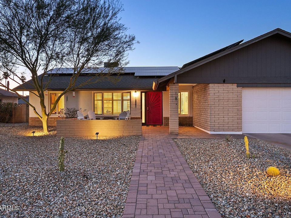 Set against the home's classic ranch elevation, the front yard is a minimalist desert vignette, designed to be a low-maintenance and provide interest from the curb. A warm welcome begins with a paver-lined path, which leads to a cozy pony-walled front courtyard. The enduring slump block exterior is updated with energy-efficient dual pane windows (2023) and a freshly painted trim. Other substantial improvements reflect a commitment to comfort and sustainability, including a new roof (2020), new HVAC system (2023) and *OWNED* Tesla solar panels. Not only is the 7.5Kw solar owned, but all the panels were replaced in 2023 with a new inverter in 2024, ensuring utility savings with no lease or added monthly cost.