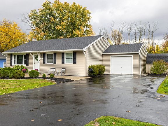 Charming, move-in ready ranch in Hilton Schools on a spacious .68-acre lot with a convenient turnaround driveway and attached 1-car garage! This 3 bed, 1 bath home has been beautifully updated and maintained. The bright white kitchen features stainless steel appliances, ample cabinet space, and direct access to the rear concrete patio—perfect for entertaining or outdoor dining. All appliances are included! Enjoy fresh paint (2023), brand new carpet (2024), and crisp 6-panel doors throughout. Full bath remodeled in 2019. Major mechanicals updated in 2018: tear-off roof, furnace, hot water tank, vinyl siding, windows, plumbing, and electric. The fully finished basement (2025) includes a NeverWet waterproofing system with transferable warranty and a sump pump with water backup. Central air for year-round comfort. Outdoor perks include a front patio, walkway, rear patio (all 2018), and a fully fenced backyard with partial privacy fencing on both sides. A rare blend of space, style, and updates! Showings begin 12/3 @9a with negotiations set for 12/9 @12p.