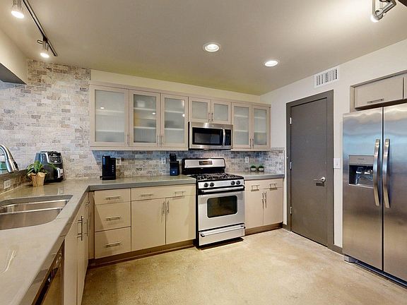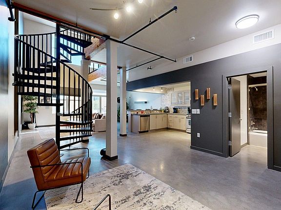 Discover the epitome of sophisticated urban living in this exquisite modern-industrial loft, nestled within the vibrant heart of the city's arts and culture district. This architectural gem boasts soaring ceilings, expansive windows, and exposed beams and duct-work, complemented by polished concrete floors, creating an ambiance of refined elegance. The open-concept layout seamlessly integrates a gourmet kitchen, featuring sleek stainless steel appliances, a striking stone backsplash, generous counter space, and a chic breakfast bar perfect for both intimate gatherings and culinary creativity. Retreat to the serene bedroom, complete with a luxurious en-suite bathroom adorned with dual sinks, offering a harmonious blend of comfort and style. A second full bathroom enhances convenience, while the versatile loft space provides an ideal setting for a home office or media room. Step outside to your private patio for moments of tranquility, or ascend to the rooftop terrace, where breathtaking city vistas await.